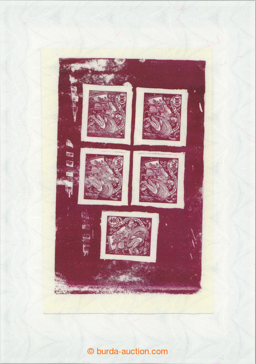 Philately. PLATE PROOF letterprint joined printing 5 copy-print 4 values 100, 200, 300 and 400h in violet color on chalky paper without gum from nedohotoveneho printing block (100h with linkovanym background), without name/-s of