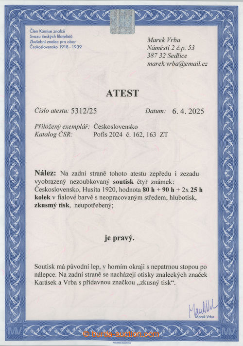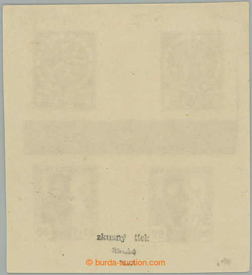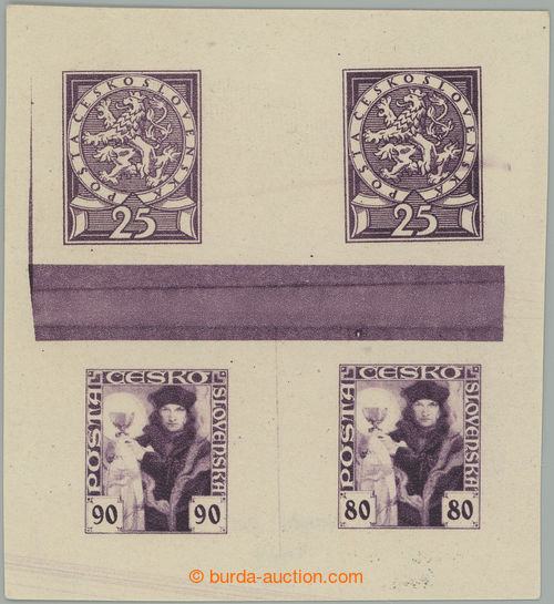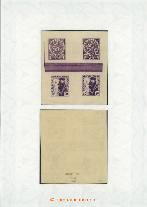 Philately. PLATE PROOF joined printing 4 pcs of plate proofs Hussite-issue 90h and 80h + 2x 25h revenue, in violet color on stamp paper with gum; quite lightly hinged at upper margin, Vrba certificate, exp. by Karasek and Vrba,