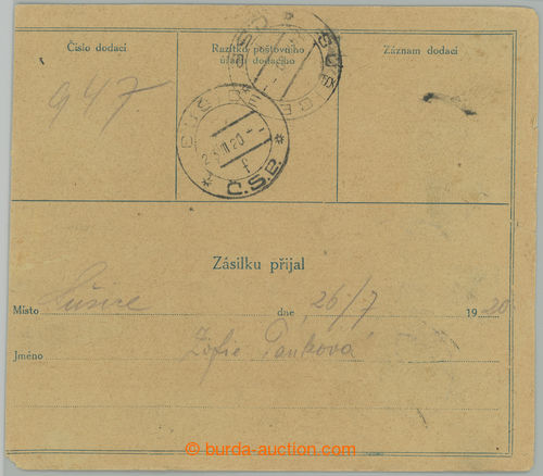 Philately. larger part C.O.D. dispatch-note with Hradcany 120h grey and krajovou pair Hussite-issue 80h violet, nationalized CDS LOUNY 1/ 22.VII.20, on reverse arrival SUSICE 23.VII.20; good condition, exp. by Sablatura (Image) (Image2)