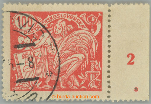 Philately. Pof.173A, 100h red, marginal piece with plate number 2, line perforation 13¾, type III.; exp. Vrba (Image) (Image2)