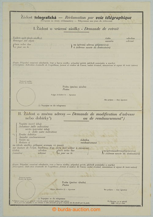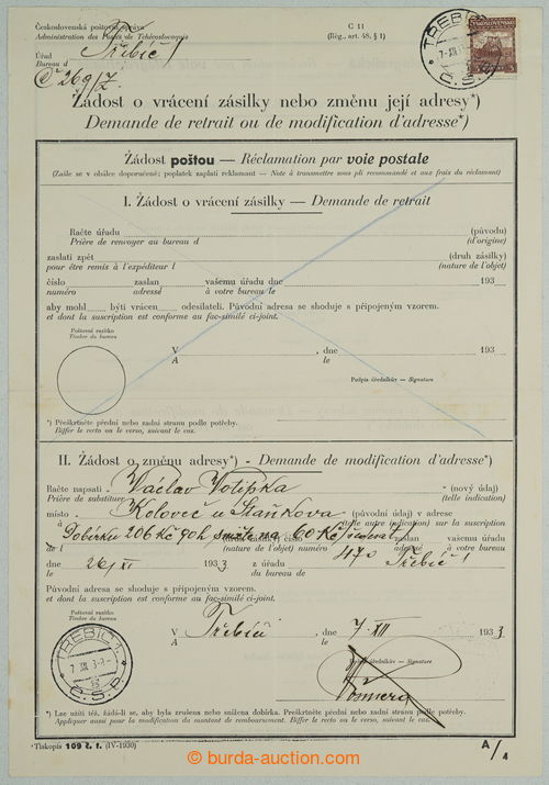 Philately. ZADOST O VRACENI MAILING NEBO ZMeNU ADRESY / used international printed matter (No. 109 No. f. (IV.-1930) fee paid stamp. Orava 3CZK, Pof.224, CDS TREBIC 7.XII.33; only cross fold (Image) (Image2)
