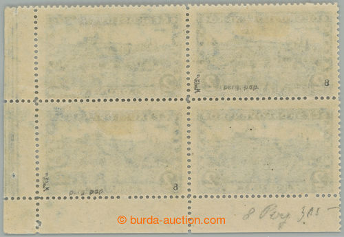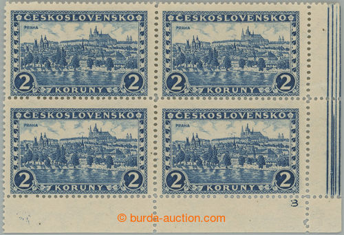 Philately. Pof.225x plate number, Prague 2CZK blue, LR corner blk-of-4 with plate number 3, wmk P8, parchment paper; hinged, exp. Vrba
