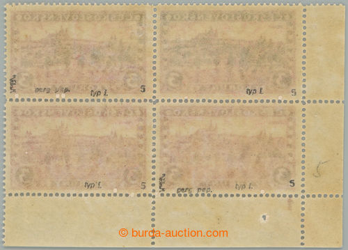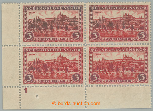 Philately. Pof.226x plate number, Prague 3CZK red, LL corner blk-of-4 with plate number 1, wmk P8, parchment paper, type I.; lightly hinged on/for upper pair stamps, slightly faded color, exp. Vrba (Image) (Image2)