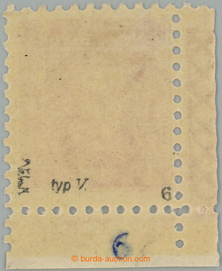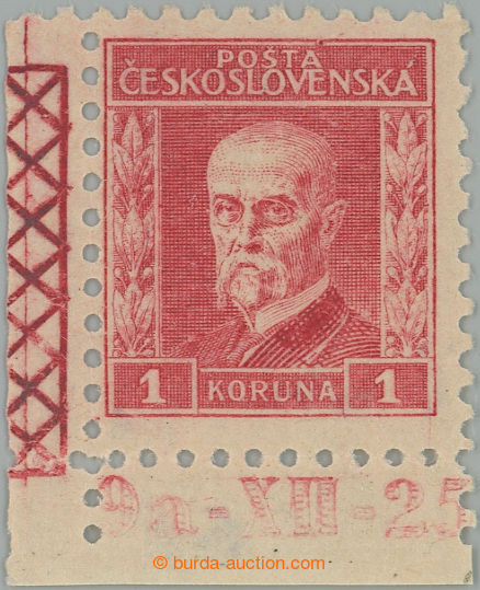 Philately. Pof.200 plate number, Gravure 1CZK red, V. type, L the bottom corner piece with plate number 9a-XII-25, wmk P6; lightly hinged, exp. Vrba