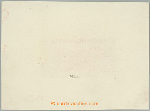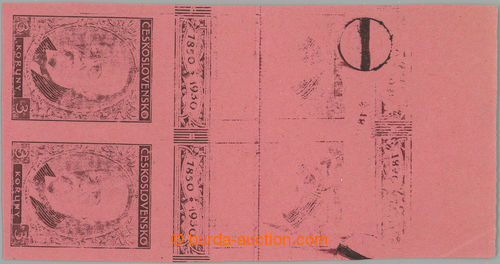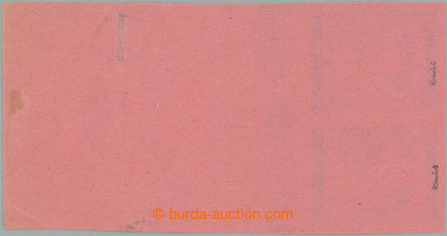 Philately. PLATE PROOF values 3CZK, proof master die in/at original violet color, Pof.262, horizontal pair with upper coupons and wide margin with print screws on pink paper without gum; exp. by Karasek (Image) (Image2)