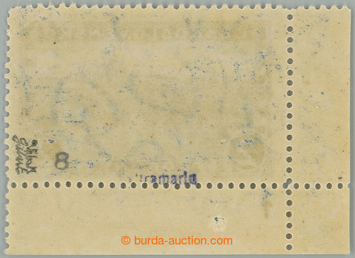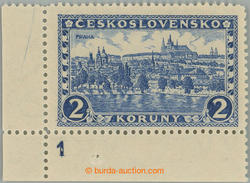 Philately. Pof.225a plate number, Prague 2CZK ultramarine, L the bottom corner piece with plate number 1, wmk P8; mint never hinged, usual minor gum fault and registry point in margin, exp. Vrba, Gilbert (Image) (Image2)