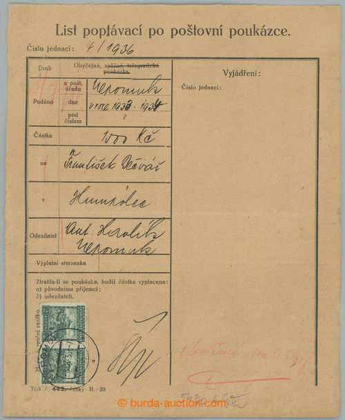 Philately. SHEET POPTAVACI perforation hole POSTAL POUKAZCE / used printed matter (c.442 cesky-II-20.), fee paid two stamp. Pernstejn 2CZK, Pof.221, CDS NEPOMUK 8.X.36; folds and small tearing (Image) (Image2)