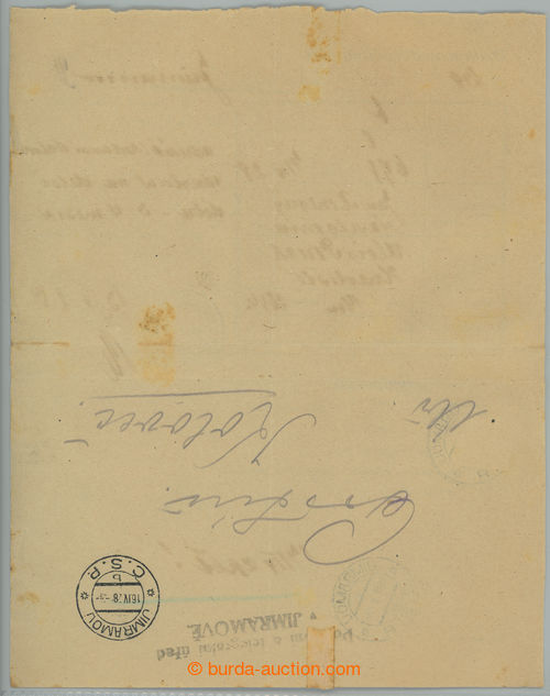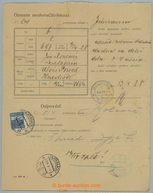 Philately. OZNAM NEDORUCITELNOSTI / used printed matter (No. 419 A. c.), fee paid stamp. Karlstejn (castle) 2,50CZK, Pof.222, answer with CDS JIMRAMOV 16.IV.28; only cross fold, slightly toned (Image) (Image2)
