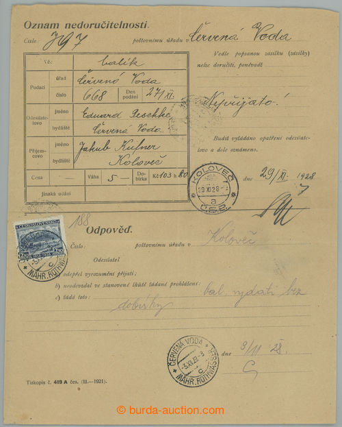 Philately. OZNAM NEDORUCITELNOSTI / used printed matter (No. 419 A. Czech. III.-1921), fee paid stamp. High Tatras 2,50CZK, Pof.240 with CDS CERVENA VODA 3.XII.28; only cross fold (Image) (Image2)