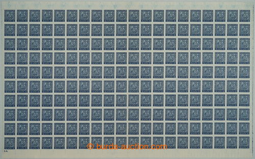 Philately. COUNTER SHEET / Pof.248, Coat of arms 5h blue, complete 200 pcs of counter sheet with plate number 1A, incl. shift roll embossing on pos. 94; very fine, only folded in perforation, rare usage complete sheets (Image) (Image2)