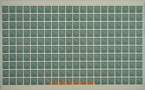 Philately. COUNTER SHEET / Pof.251, Coat of arms 25h green, complete 200 pcs of sheet with plate number 1; very fine, only folded in perforation, rare usage complete sheets (Image) (Image2)