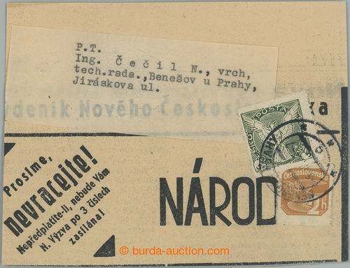 Philately. SMISENA FRANKATURA / cut square from newspaper cover with address, with mixed franking newspaper stmp issues Sokol 5h green and Pigeon-issue 2h yellow-brown, Pof.NV2 + NV14, both stamp. with private vertical perf,