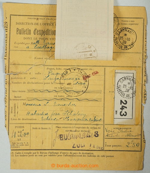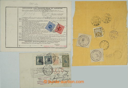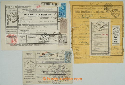 Philately. comp. 3 pcs of foreign parcel cards / France, Romania, Tunis / addressed to Czechoslovakia with fee paid Postage due stamps issue Ornament 30h, Hradcany to exhaustion-issue 50/75h + 60/75h, Definitive 1CZK + 10h, various
