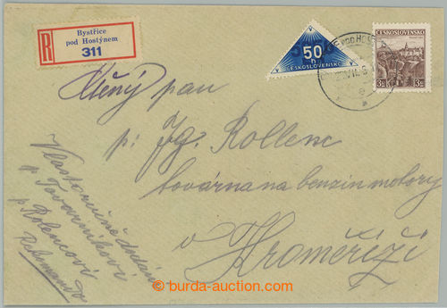 Philately. firmeni Reg letter strictly private franked stamp. Bohemian Paradise 3CZK brown and delivery 50h blue, Pof.DR1B (II. printing), CDS BYSTRICE P. H. 20.VII.38; nice good condition (Image) (Image2)