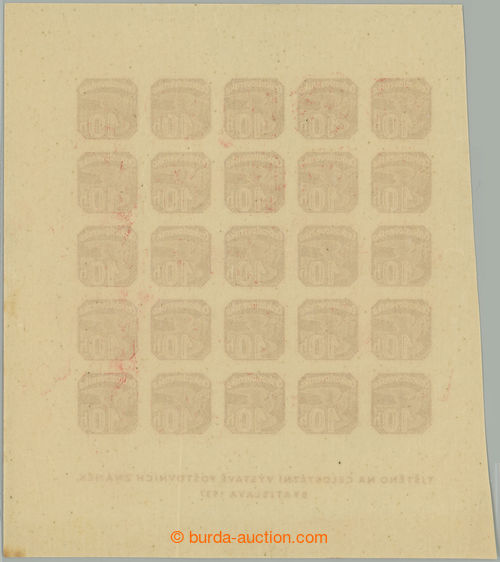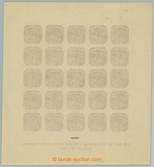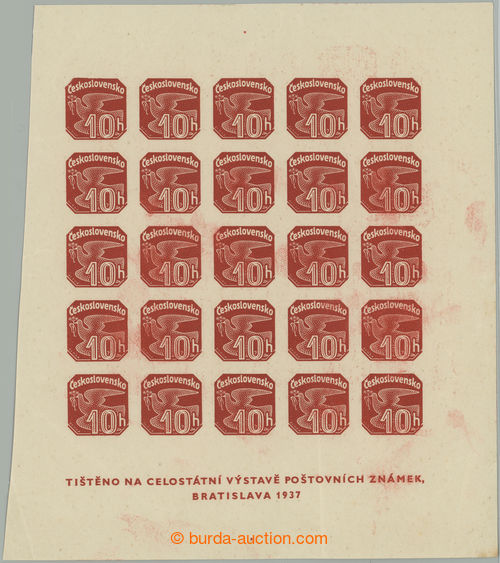 Philately. Pof.ANV18 VII, miniature sheet Bratislava 1937, rarest VII. TYP with red points at top and lower, in front hints printing color; mint never hinged, production folds in paper, L cut, spots, Vrba certificate, minimum