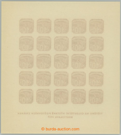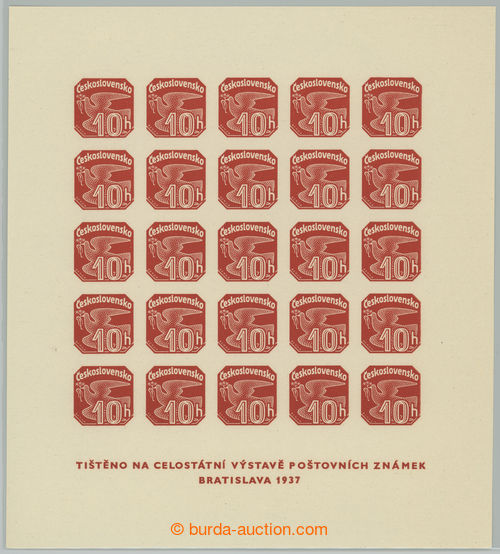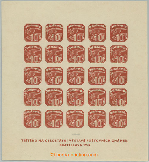 Philately. Pof.ANV18 plate variety, miniature sheet Bratislava 1937, with favourite plate variety - missing line after/behind word ZNAMEK, type Vc; superb (Image) (Image2)