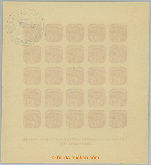 Philately. Pof.ANV18 VIb, miniature sheet Bratislava 1937, rare type VIb with special postmark BRATISLAVA; mint never hinged, R lower bend in corner, on request exp. Vrba, rare usage (Image) (Image2)