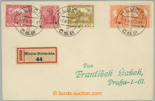 Philately. ATTACHED TERRITORY / HLUCIN (Hultschin), Reg letter with mixed cesko-nemeckou franking, Hradcany 20h carmine and 30h yellow + German stamp. Germania 7½Pf (2x) and 10Pf, posting Czechosl. CDS HLUCIN 5.II.20, sent to F.