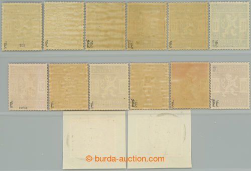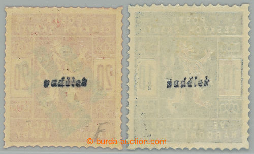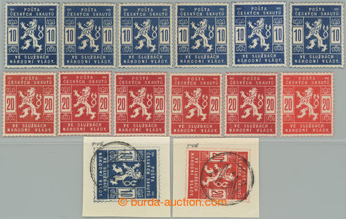 Philately. Pof.SK1-SK2, 6x 10h blue and 5x 20h red, various odstinove nuance, then 20h light red and complete set on cut-squares with cancel. N.V.; 20h light light hinged, several single minor faults, mainly but mint never hinged,
