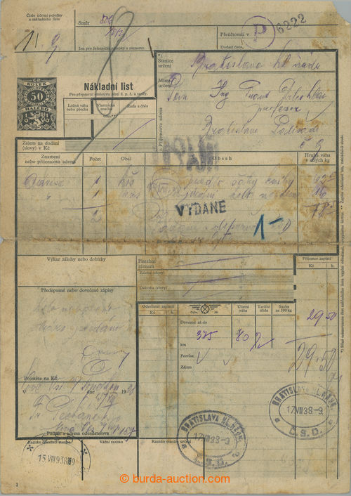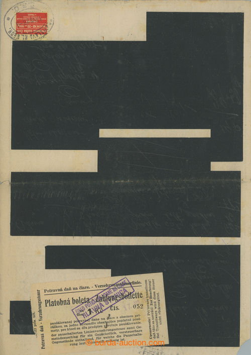 Philately. BOLETA / Platebni bollette - Zahlungsbolete 1CZK, slovensko-nemecka variety bollette/-s, pripevnena kancelarskou sponkou on reverse Nakladniho sheet with imprinted stamp 50h, sent from Nova Ves above P. to Bratislava;