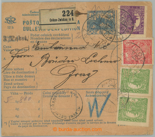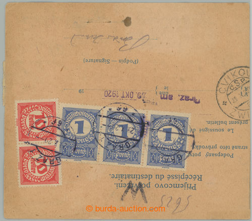 Philately. Mng.J76, larger part international dispatch-note CPP11 addressed to to Austria, uprated with stamp Hradcany 1000h, 2x perforated 10h green and issue Agriculture and Science 1920 300h, all stamp. with perfin J.N. f. J.