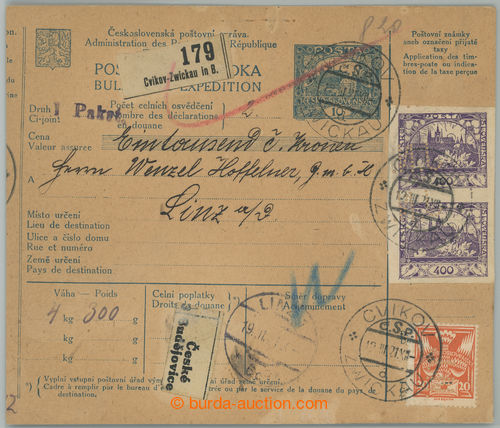 Philately. Mng.J76, larger part international dispatch-note CPP15 addressed to to Austria, uprated by. pair stamp. Hradcany 400h violet and pigeon 20h orange, all stamp. with perfin J.N. f. J. Niessner, mechanicke tkalcovny Cvikov,