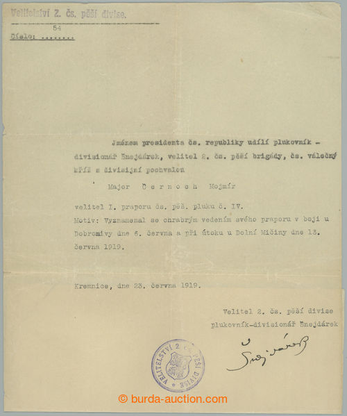 Philately. POLISH CAMPAIGN / SNEJDAREK Joseph (1875-1945), Czechoslovak General, commander fight for Teschen Silesia, legionnaire, autograph on udelovaci cyklostylove document with autograph; majoru Mojmiru Cernochovi is udelen War