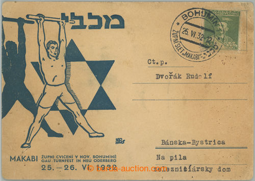 Philately. ZUPNI FESTIVAL MACCABI/ BOHUMIN 1/ 26.VI.32, black cancel. on/for Us card with blue additional-printing to/at same sports action, on reverse evidently signatures participants; slightly toned, overall good condition (Image) (Image2)