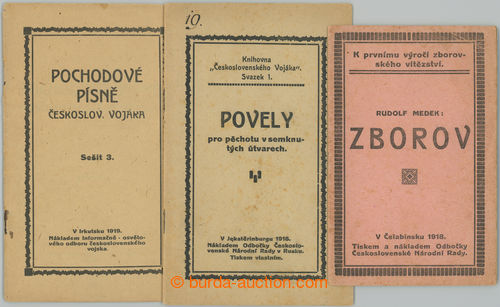 Philately. CZECHOSLOVAK LEGIONS / comp. of 3 legionaire brozur issued in/at Rusku: manual Povely for pechotu in/at semknutych utvarech (Jekaterinburk 1918) + Pochodove song ceskoslov. soldier. Sesit 3. (Irkutsk 1919) + R. Medek: