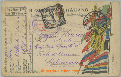 Philately. ITALY / POSTA MILITARE 52, card Italian FP to Sulmony, postal imprint PM 52 with dots/ 7.8.18, supplemented with round violet cancel. 2. REGGIMENTO CZECO-SLOVACCO/ AMMINISTRAZIONE with emblem, line censorship cancel. and