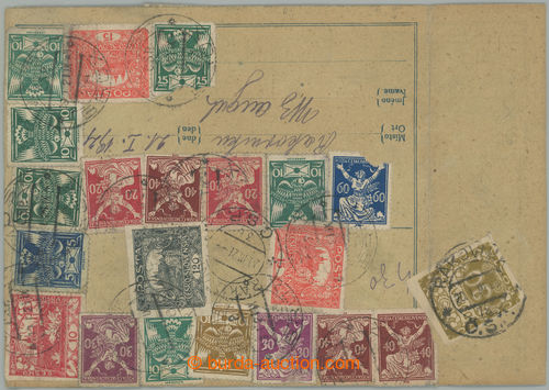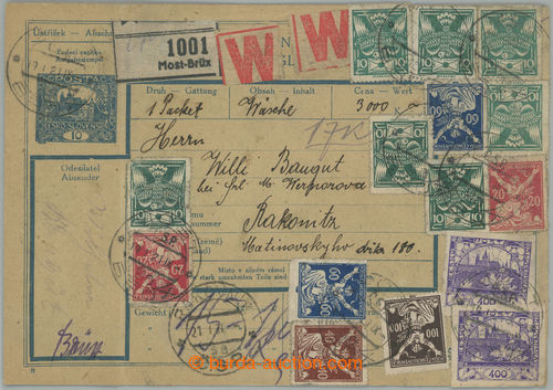 Philately. CPP4B, whole parcel card with printed stmp Hradcany 10h blue, Czech-German variety, for parcel in/at price 3.000CZK addressed to Rakovnik, richly paid/franked on both sides 35 pcs of (!) stamp. issues Hradcany, issue
