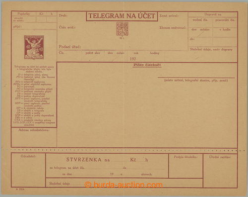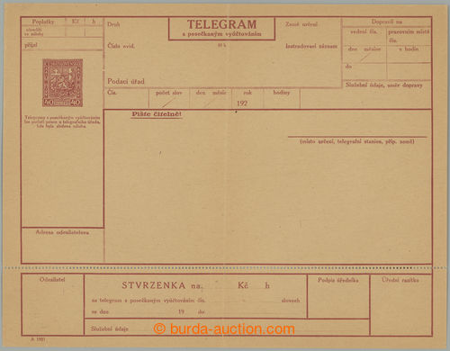 Philately. CTU4A, telegram with poseckanym account Coat of arms 40h brown, complete incl. confirmation, Czech text, date of printing 192_, perf 11½, lower mark A 1927; only light vertical fold in the middle, perfect condition,