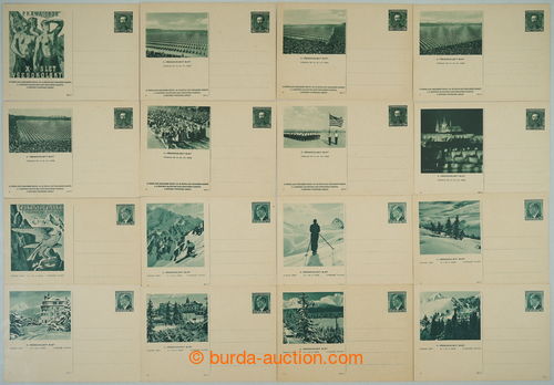 Philately. CDV70/1-8 + CDV71/1-8, X. Sokol festival 1938 + Winter Sokol Games, 2 complete set pictorial post cards Tyrs 50h and Benes 50h, all Un; only sporadically slightly wrinkled corners (Image)
