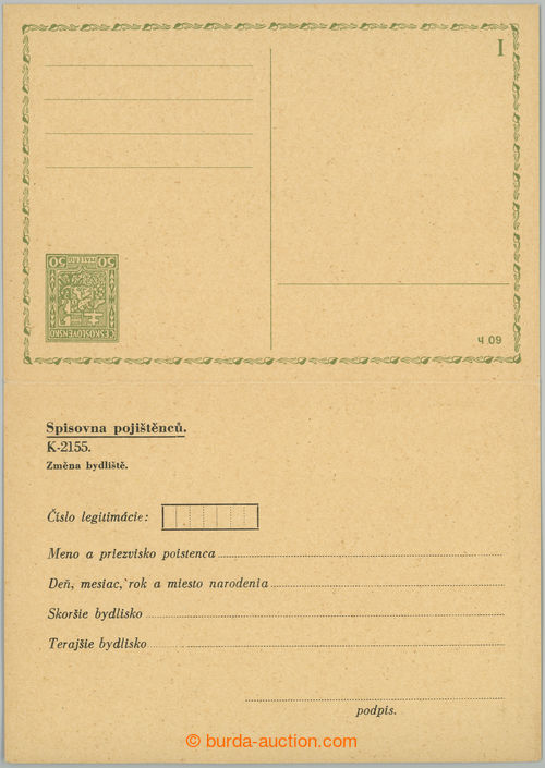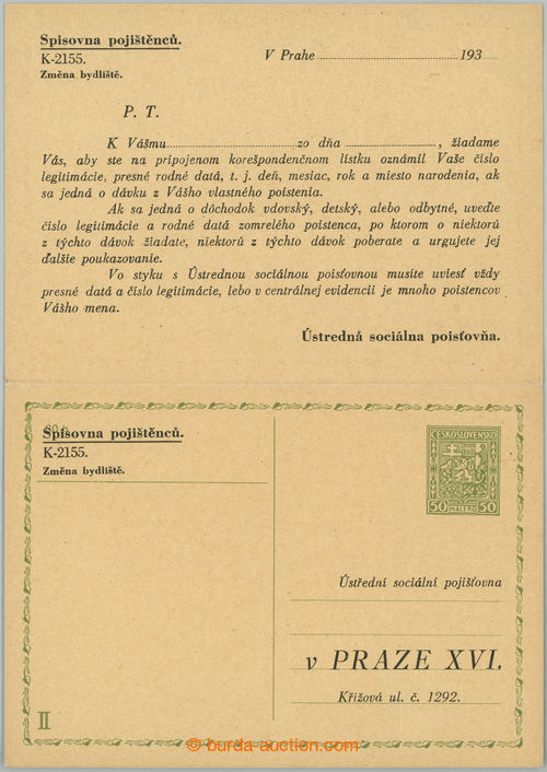 Philately. SOUKROMY PRITISK / CDV66, Coat of arms 50h, double PC for inland, additional printing of Social Insurance General Office in slovenstine in black color; Un, very fine and sought (Image) (Image2)