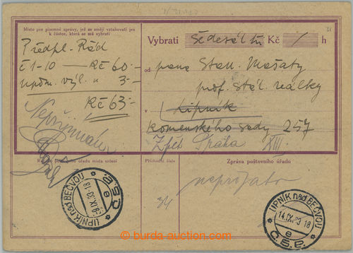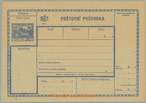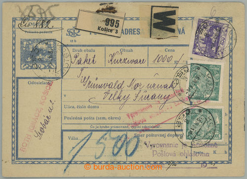 Philately. CPP1C, whole used p.stat dispatch-note Hradcany 10h blue, Slovak (!) variety, on/for mailing valuable parcel, postal-charge 5CZK postpaid with stmp Hradcany 400h + stamp. issue Agriculture and Science 2x 100h green, CDS