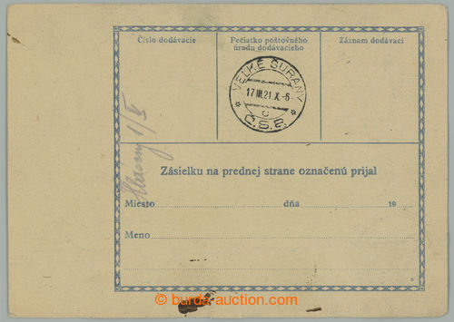 KOSICE 3/ 15.III.21, on reverse arrival postmark VELKE SURANY 17.III.21, supplemented with red and violet straight line postmark Vyrovnanie is nemozne/ Post ohlasovna KOSICE 5/VIII 1919; only small bend, rare occurrence! (Image) (Image2)