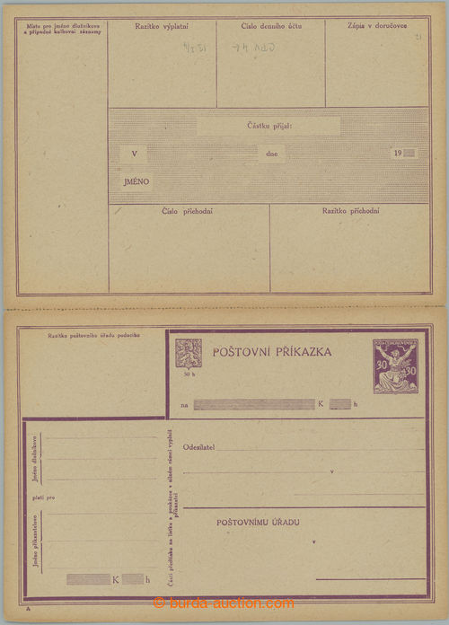 Philately. CPV4b, issue Chainbreaker 30h violet, complete Un order card with sale price 50h, perf 13½; partially povolena perf (underglued), toned in margins (Image) (Image2)