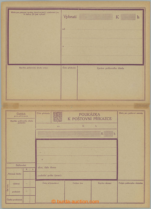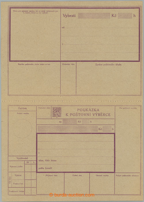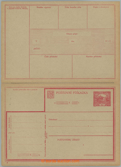 Philately. CPV3A, order card Hradcany 20h red with emblem, Czech text; only partially povolena perf, slightly toned in margins (Image) (Image2)