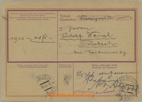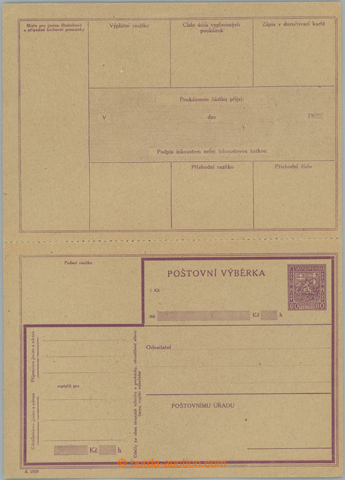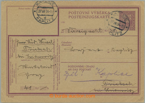 Philately. stationery CPV12Ba, part I post. order cards, issue 1929, additionally printed stamp. Coat of arms 80h violet, Czech - German variety (!), CDS KAPLICE 27.VIII.34, on reverse CDS TREBUSIN 29.VIII.34; only folds in