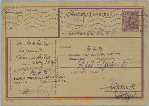 Philately. CPV12a, Coat of arms 80h violet, I. part post. order cards with printed stmp., perf 7, 7 lines, posting MC PRAGUE 55/ 6.IX.33, arrival postmark LIPNIK N. B. 9.IX.33; good condition (Image) (Image2)