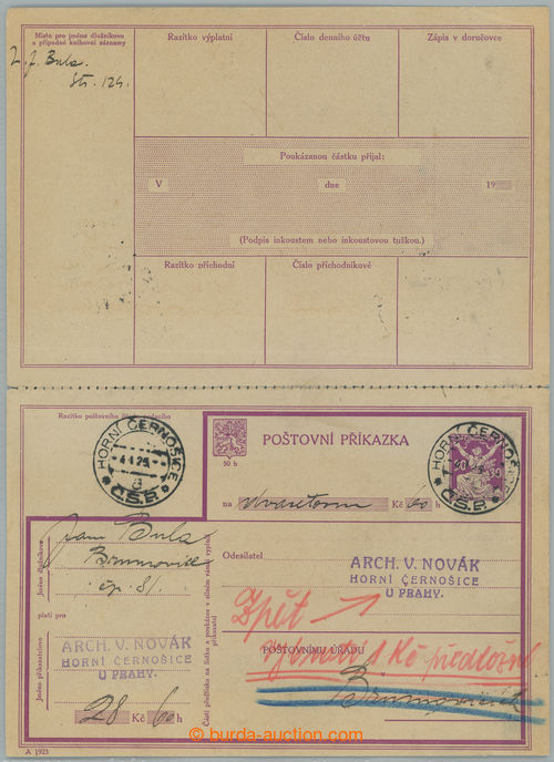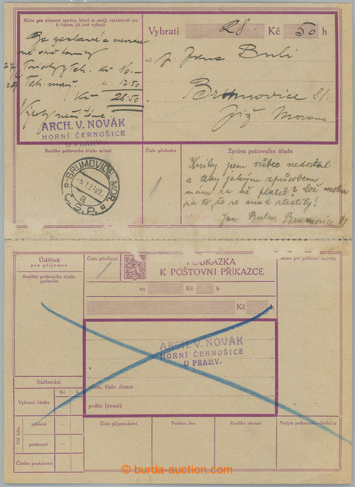 Philately. CPV6b, complete order card, issue Chainbreaker 30h violet, emblem 50h, 19 lines, CDS HORNI CERNOSICE 4.I.25, sent back with CDS BRUMOVICE MOR. 5.I.25; underglued povolena perf, rare double Us order card/-s! (Image) (Image2)