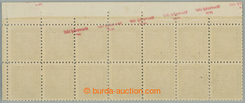 Philately. Sy.4 VPP, Coat of arms 20h red, L marginal 28-blok with horiz. shifted overprint; 2x finger-print, otherwise mint never hinged multiple