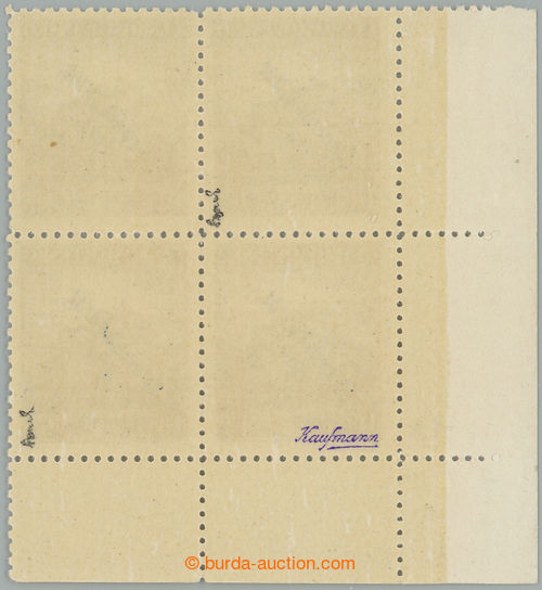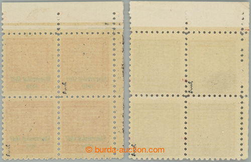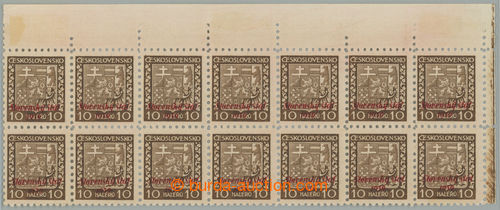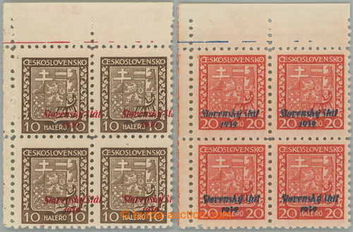 Philately. Sy.3 VPP, 4a, Coat of arms 10h and 20h, comp. of 2 L upper corner blk-of-4 with print nastavovaci ledge above PPo1-2, value 10h in addition with significant shifted overprint transport to to perf; mint never hinged, 20h
