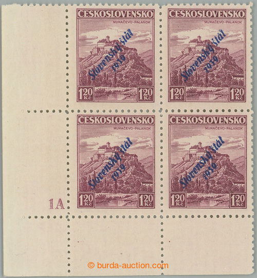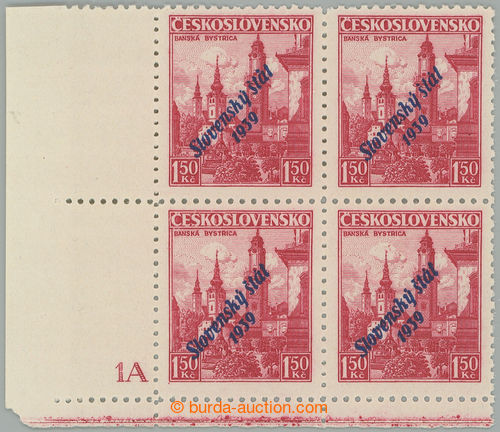 Philately. Sy.14, Banska Bystrica 1,50CZK, LL corner blk-of-4 with plate mark 1A, UO - close margin, from 100 pcs of sheet, overprinted the bottom part/-s overprint folder (identification according to plate variety on pos. 81);