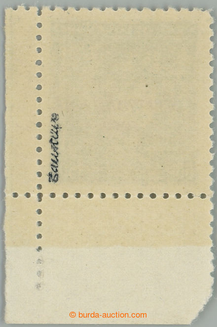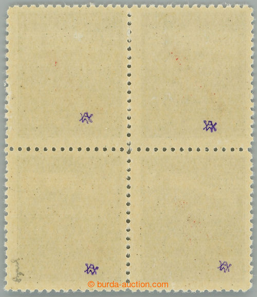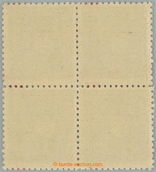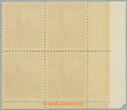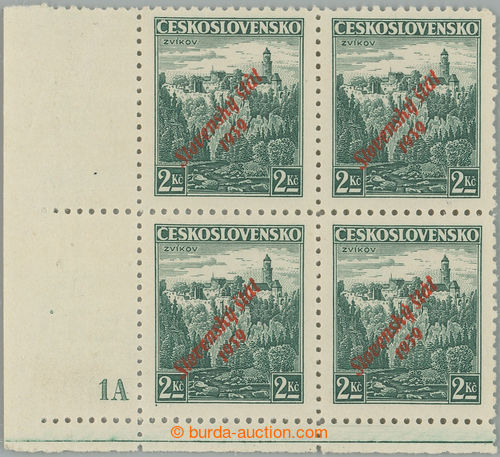 Philately. Sy.16 plate mark, Zvikov 2CZK green, LL corner blk-of-4 with close margin and plate mark 1A, overprint in/at brick red color; mint never hinged, production defect in gum (Image) (Image2)