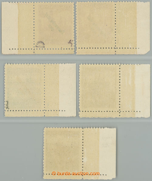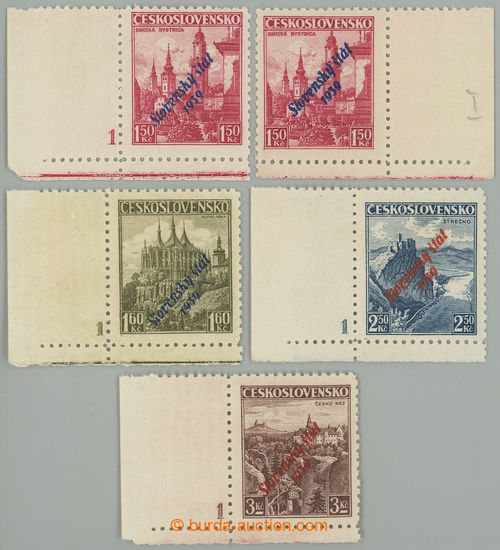 Philately. PLATE NUMBERS/ Sy.14, 15, 17, 18 plate mark, comp. 5 pcs of corner pieces with close margin from that 4x with plate number 1, value 1,50CZK incl. right bottom corner piece, then values 1,60CZK, 2,50CZK and 3CZK; all mint