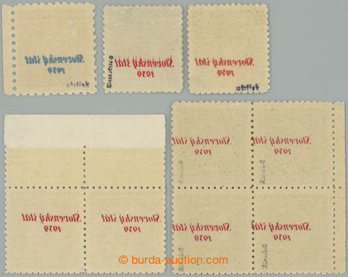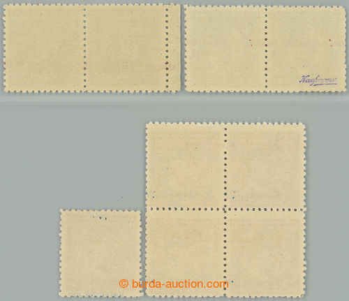 Philately. STROJOVE OBTISKY / Sy.4, 8, 9, 10 SOP, comp. 3 pcs of stamp. + pair and block of four, partially marginal, with machine offsets overprints on gum; mint never hinged, 1x exp. by Karasek (Image) (Image2)