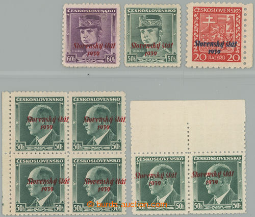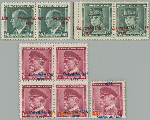 Philately. POSUNY PRETISKŮ / selection of horiz. 2-paskek Benes 50h and Stefanik 50h and block of four with jednotlivou stamp. T. G. Masaryk 1CZK with various significant vert. and horiz. shifts overprints to to perf; mint never