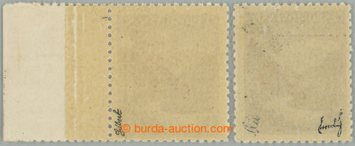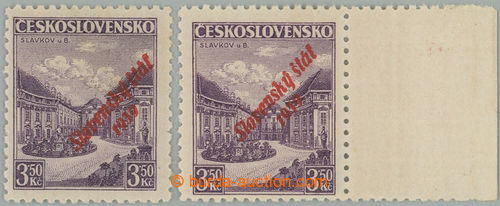 Philately. Sy.19a, Slavkov 3,50CZK violet, red Opt, comp. 2 pcs of stamp., 1x with R margin; mint never hinged, exp. by Gilbert., Nov