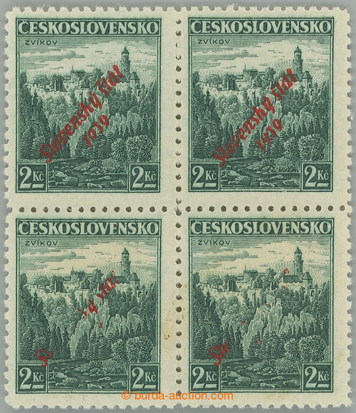 Philately. Sy.16 production flaw, Zvikov 2CZK green, block of four, on/for bottom 2 stamp. significant incomplete overprint; mint never hinged, small dirty bottom stamp., exp. Synek (Image) (Image2)